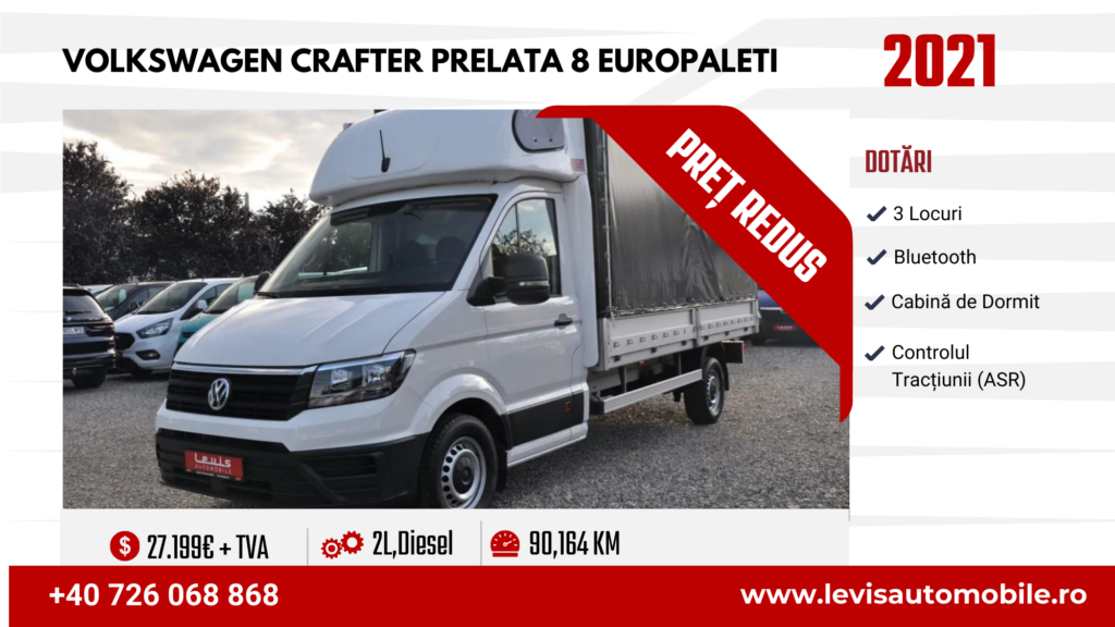 **** Echipa Levis Automobile depune eforturile necesare pentru ca informaţiile oferite în anunţurile postate să fie reale, corecte şi actualizate. Pot exista anumite erori/greșeli gramaticale/omisiuni în detaliile anunțurilor. Levis Automobile nu îşi asumă răspunderea pentru eventualele erori/greșeli gramaticale/omisiuni pe care acestea le-ar putea conţine. Va rugăm să solicitați consilierului de vânzari confirmarea că datele trecute în anunțul referitor la Volkswagen Crafter Prelata 8 Europaleti sunt reale, corecte și actualizate. De asemenea, la vizionarea mașinii în parcul nostru, verificați ca datele menționate în anunț să corespundă, în realitate, cu datele mașinii.